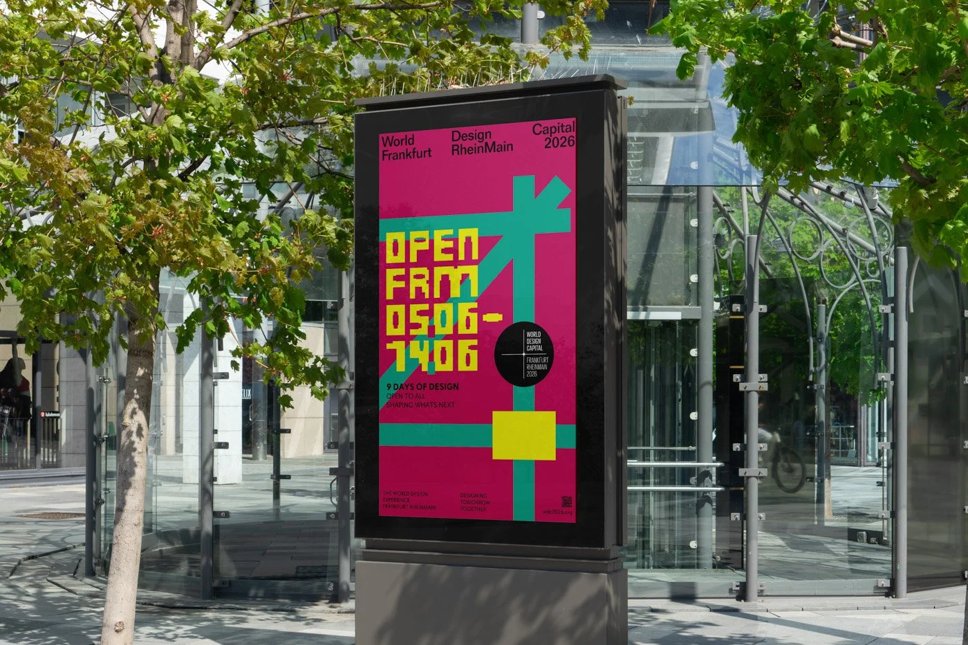 Die Stadt Frankfurt ist im Jahr 2026 World Design Capital (WDC). Unter der Überschrift “Open FRM” finden dabei verschiedene Veranstaltungsformate statt. Für die Agentur Nordisk, wurde ein einheitliches und vielseitig einsetzbares Erscheinungsbild für die Formate gepitcht.