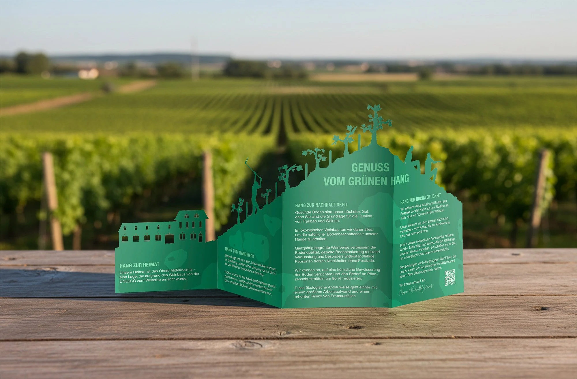 Ergänzend dazu wurde ein Flyer gestaltet, der zugleich als Flaschenmanschette dient. Die Außenseite zeigt Motive des Ernteprozesses in der Steillage und kann dekorativ um die Flasche gewickelt werden. Die Innenseite informiert über den Anbau und das Weingut.